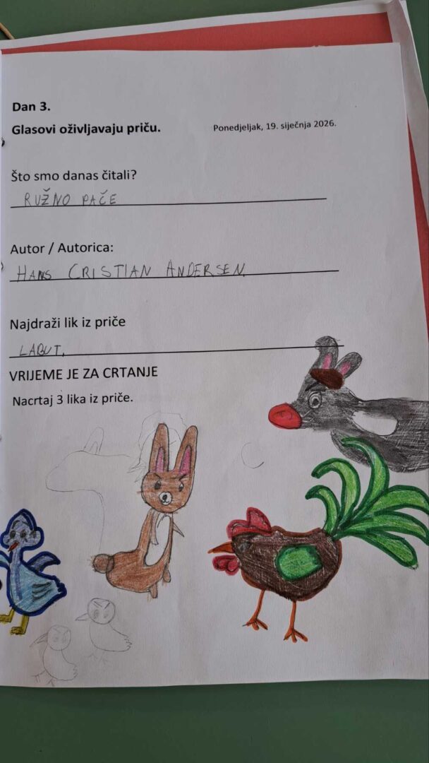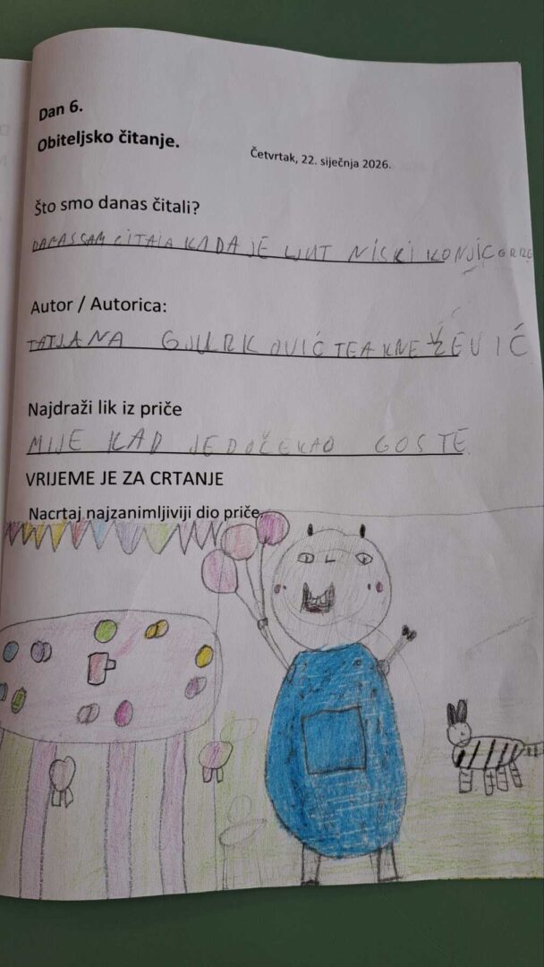 Od 15.01. – 4.02. 2026. učenici H razreda su čitali i slušali bajke, slikovnice, priče o emocijama. Svakodnevno su vodili dnevnik čitanja, zapisujući najbitnije i naj zanimljivije dijelove priča kao i oslikavanje naj zanimljivijih dijelova priča. Učenici su tijekom ovog projekta bili vrlo zainteresirani, počeli su aktivno sudjelovati u slušanju i čitanju priča. Tijekom 15 dana čitanja učenicima se produžila koncentracija, bili su mirniji, empatičniji jedni prema drugima, puno više pomagali jedno drugome ali su postali puni poštovanja za svačiji rad i mogućnosti.
