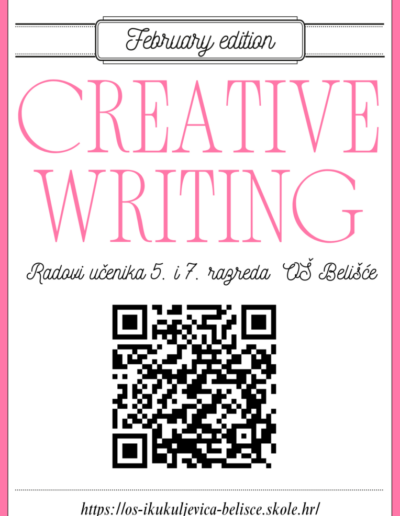 Učenici 5. i 7. razreda naše škole pod vodstvom nastavnice Ene Golik sudjelovali su u pisanju sastavaka i pjesama na engleskom jeziku. Teme su birali sami, a njihove izvrsne radove možete pročitati u izrađenom online magazinu. Kao što je navedeno, ovo je izdanje za veljaču, a s obzirom njihovu kreativnost i volju za pisanjem nadamo se da će izdanja biti još više.