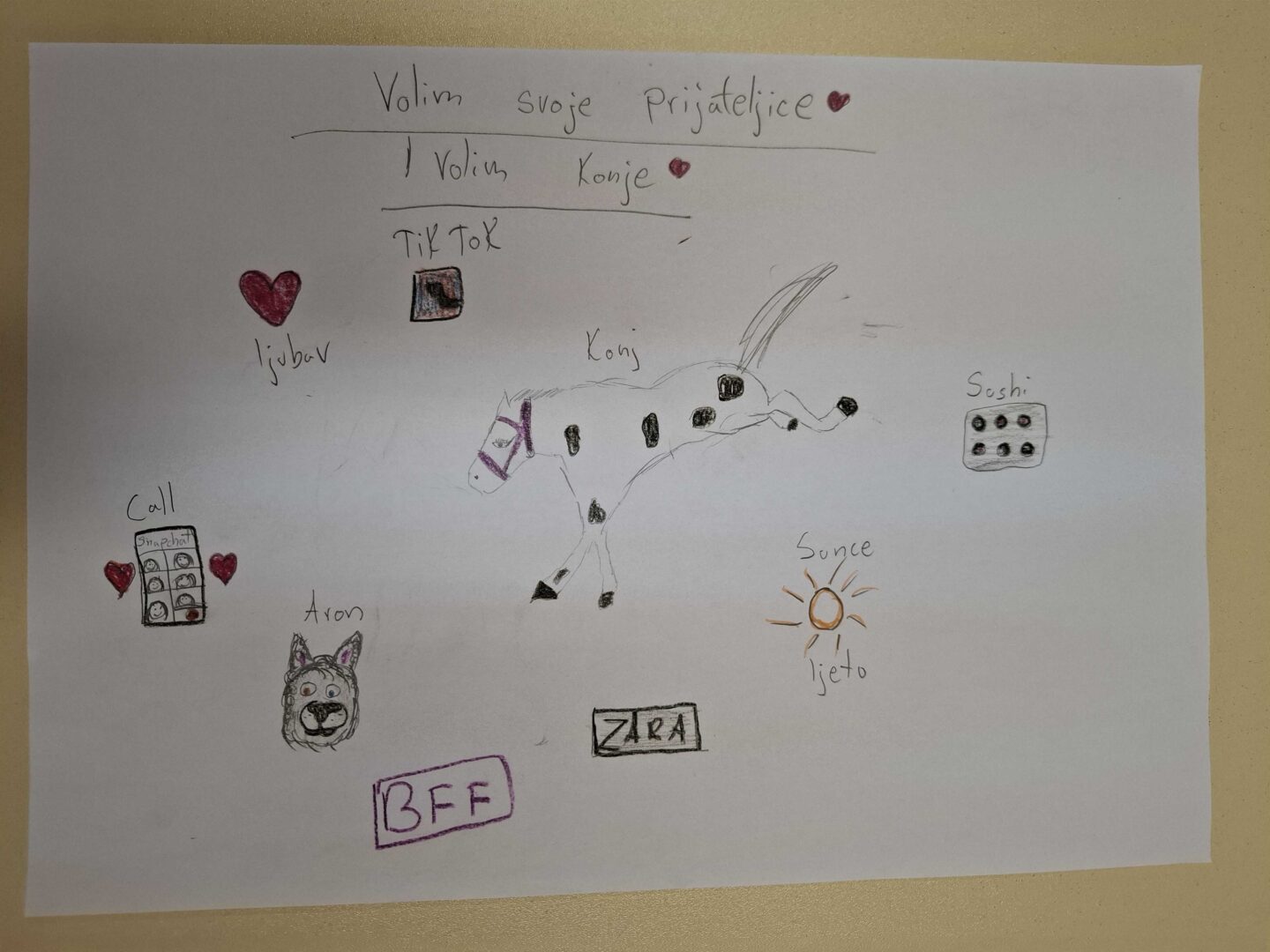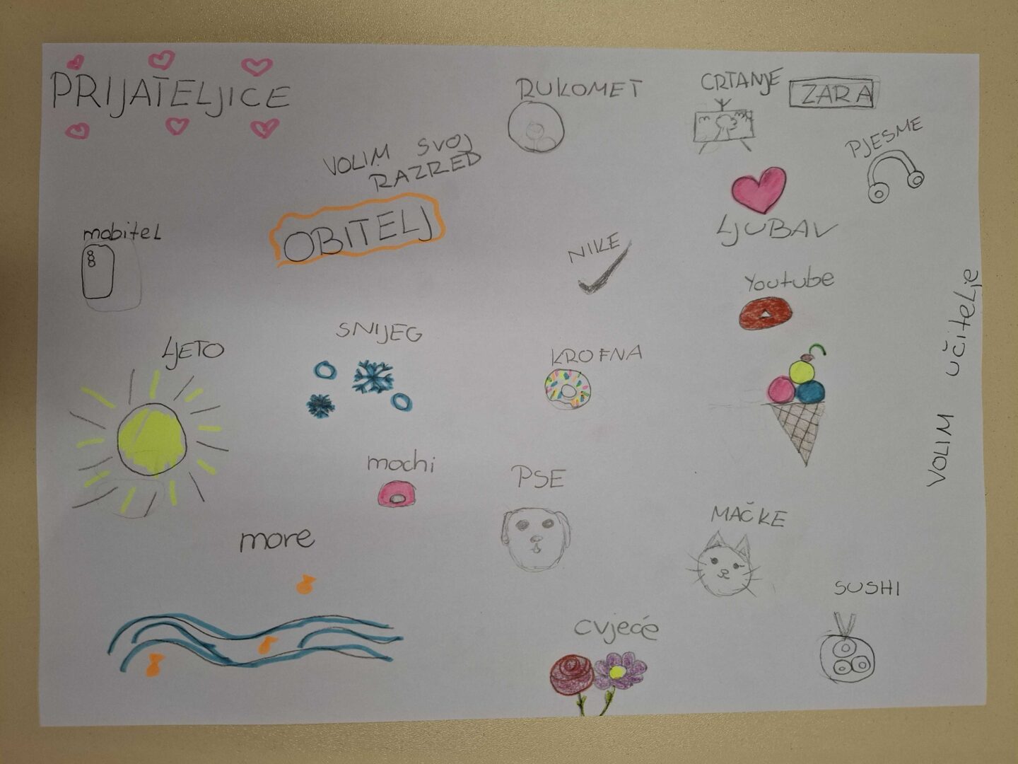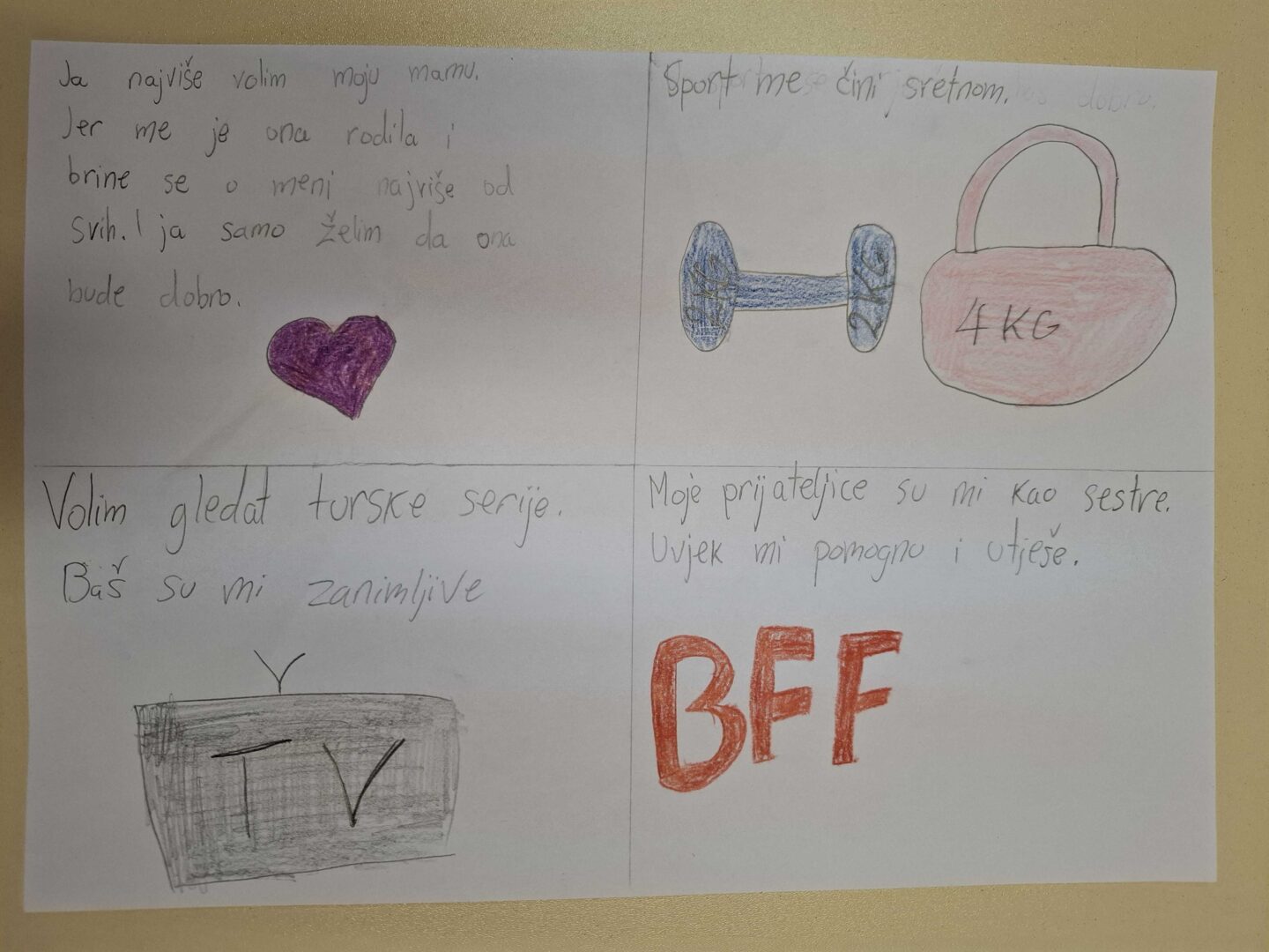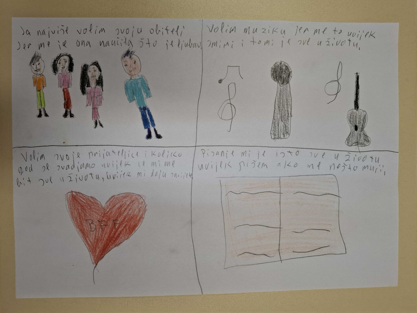 Učenici su crtanjem i pisanjem identificirali voljene osobe, predmete, aktivnosti i pojave, nakon čega su imali priliku razgovarati o događajima i navikama iz svakodnevnog života u korelaciji sa zadatkom. Uvažavali su razmišljanja i osjećaje drugih učenika, prepoznali su sličnosti i razlike među sobom, pokazali umijeće aktivnog slušanja i time konkretno pružili primjer dobrog odnosa i ljubavi prema drugima.